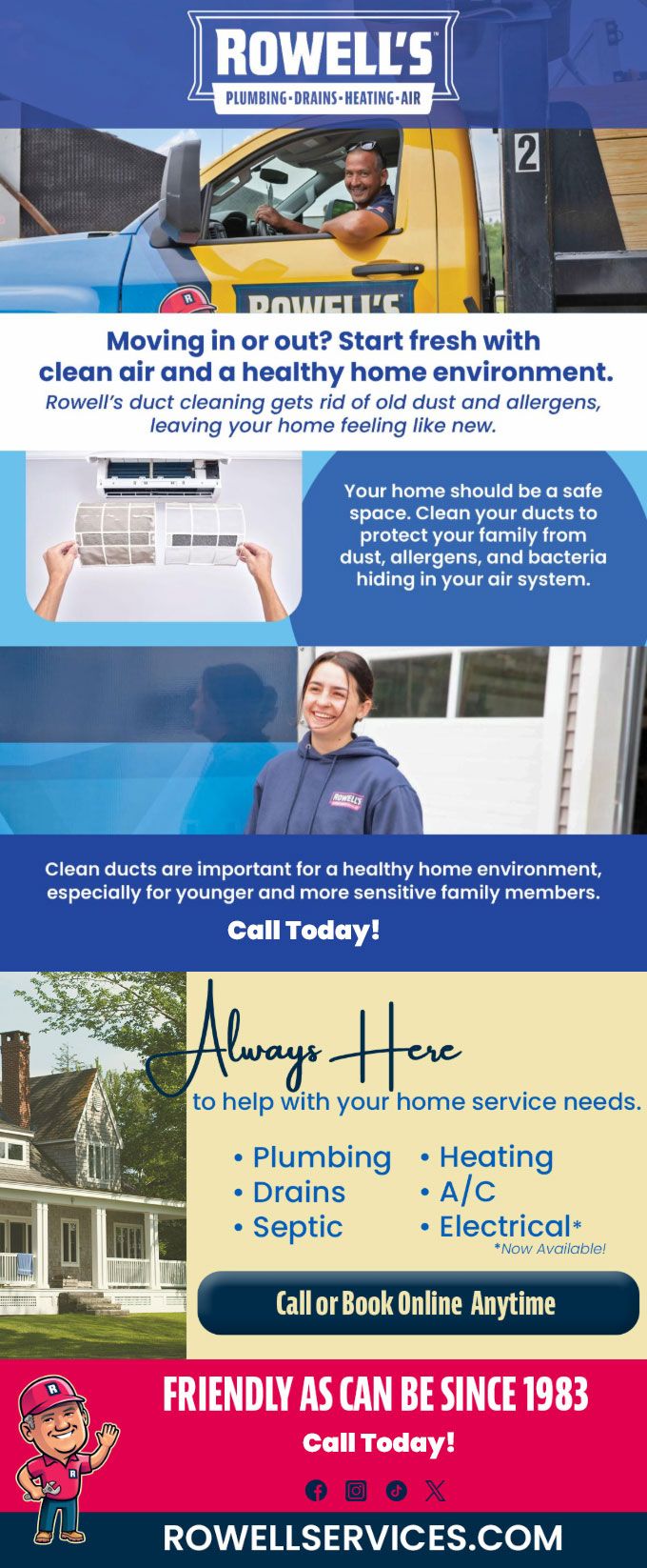 "Friendly As Can Be Since 1983!" When you need help with your plumbing, drains, heating, cooling or electrical in Litchfield, you can always rely on Rowell's Services! Call us now or book online!
